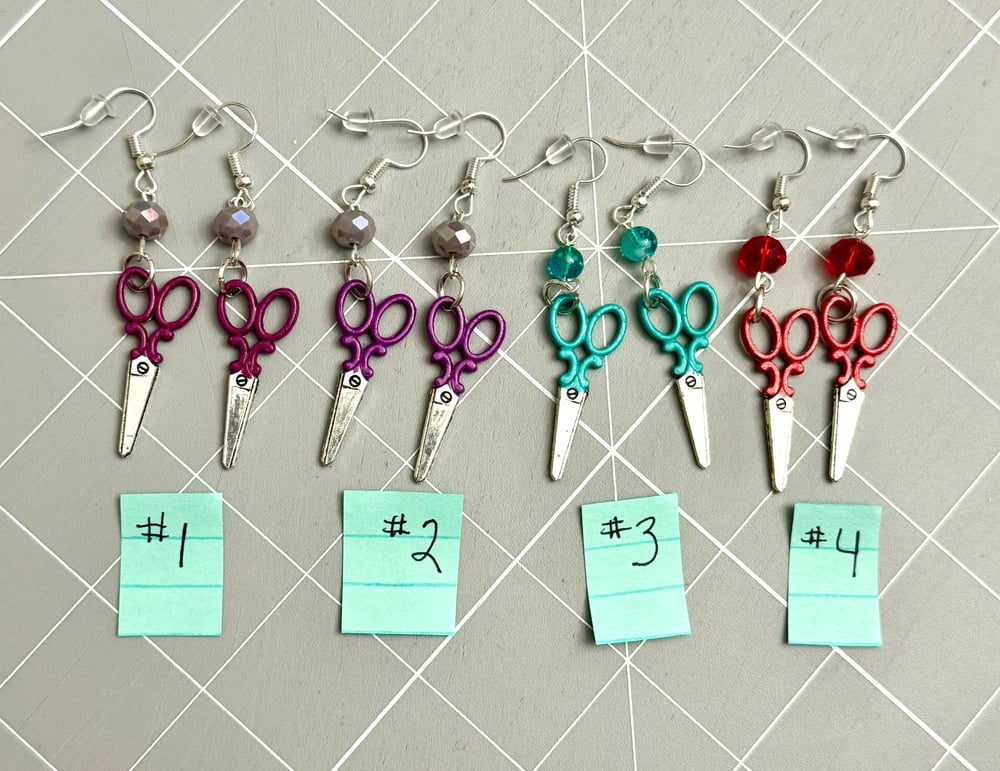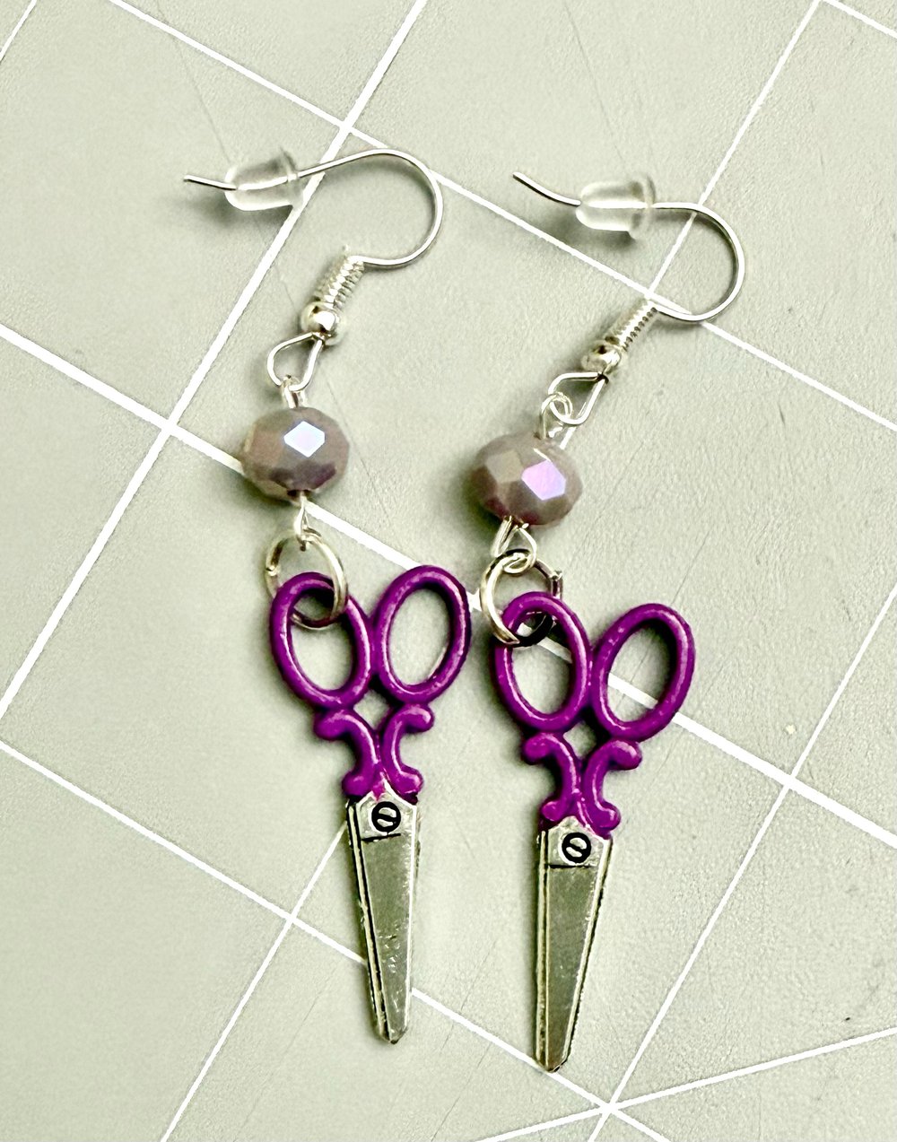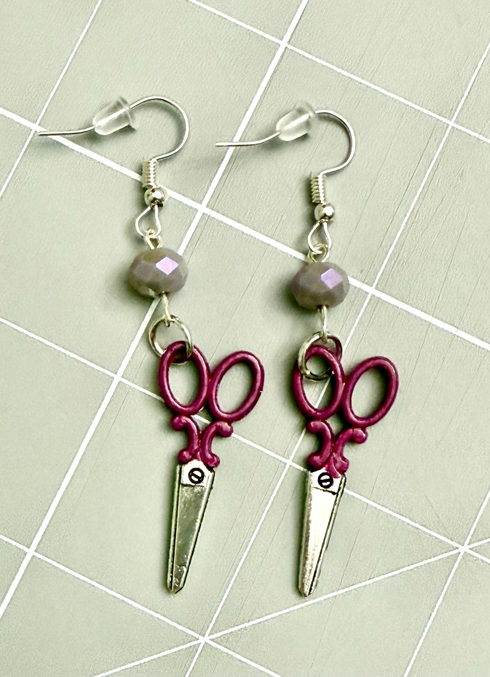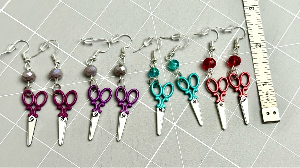 These dangle sewing scissor earrings have charms that have been hand-painted and protected with a water-based sealant.